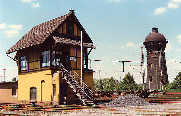 Letzte Relikte historischer Eisenbahn-Architektur traf Helmut Neßeler am 10.07.1988 im Rangierbahnhof Duisburg-Ruhrort Hafen an: Stellwerk Rt V/VI, rechts der 1992 abgebrochene Wasserturm.